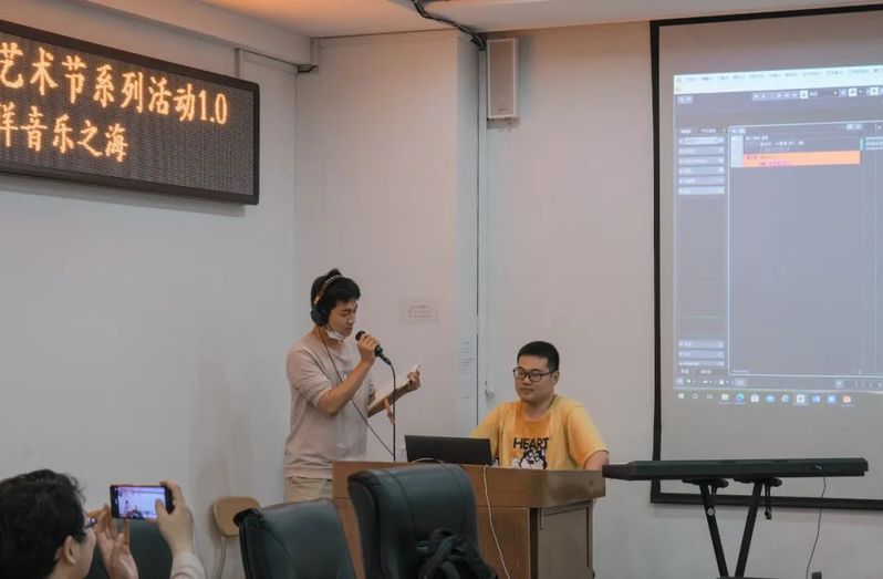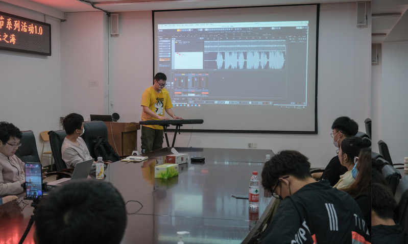 当然,要想创作一首歌曲,有好的想法是不够的,还必须有扎实的作词作曲和编曲基础。舒鹏程用通俗易懂的方式详尽的讲解了音乐的基础乐理知识,让大家对乐理理论以及乐曲知识这一神秘的领域有了基本的认识;纸上得来终觉浅,绝知此事要躬行,随后舒鹏程结合自己独立创作的原创歌曲《待到樱花烂漫时》为大家讲解了音乐创作中编曲的各类知识与细节。音乐创作并非易事,其中困难重重,从一个idea到编曲作词成型再到上台演唱,每一个环节都要注入大量的努力和勤奋,音乐创作更像是一次次惊险的旅途探险,虽历经艰辛,但也收获颇多。