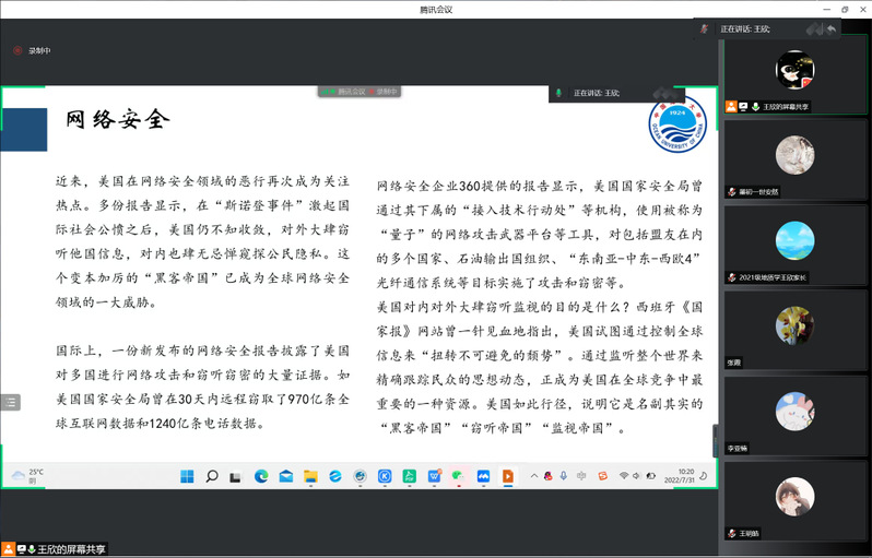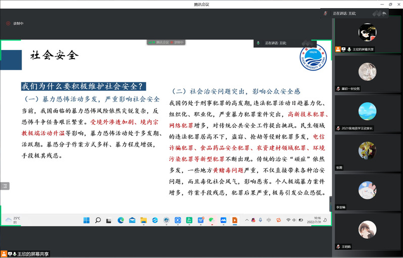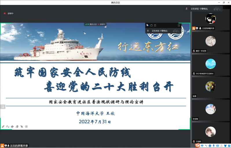 7月31日,“筑牢国家安全人民防线,喜迎党的二十大胜利召开”国家安全教育进社区普法现状调研与理论宣讲团面向山东省烟台市上刘家居委会于腾讯会议开展线上国家安全教育进社区理论宣讲活动,结合实际案例,系统的讲解国家安全体系涵盖的16种安全。本次宣讲由2021级地质学专业王欣主讲。