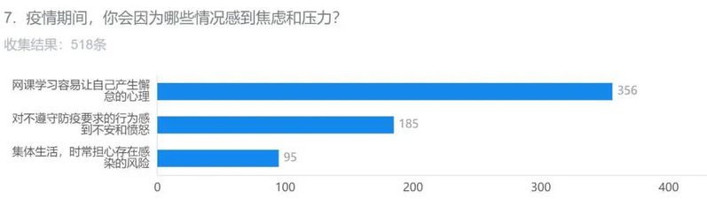 从这个对比中可以清楚地看到,高校对于疫情的严格把控大大降低了大学生对于自身安全的担忧和焦虑,目前占据主体地位的还是大学生对学业的要求与疫情期间上网课降低大学生学习质量之间的矛盾而产生的压力和焦虑。