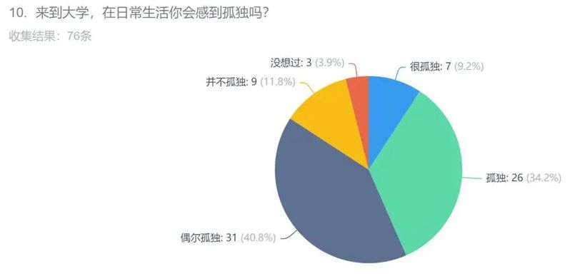 在“来到大学,日常生活中你孤独吗”这个问题中,处于偶尔孤独-孤独之间的人数占总体的73%,但同时也有占总数一半的人认为孤独是大学生活中的常态,应该要学会适应孤独、享受孤独,和孤独成为朋友。