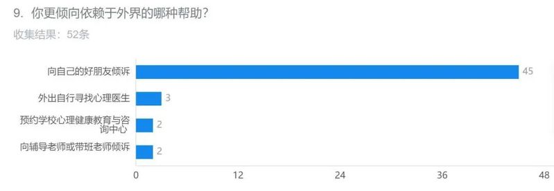 班级作为学院把握学生心理健康的第一主战场,其中心理委员上传下达的作用显得尤为重要,调研中发现44.8%的人认为心理委员发挥的作用较大,并能够关注到每一位同学的情绪,35.5%的人认为心理委员发挥了一定作用,但无法关注到每一位同学,19.7%的人认为心理委员没有发挥到作用。对于第三种情况的调研,发现45.8%的人认为学院举办的活动很少和心理委员挂钩,这是一个值得心理健康组织反思的问题,这说明在之前的活动中心理健康组织与班级之间的联系并不密切,今后工作中需要调整。