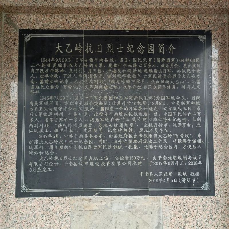 大乙岭抗日烈士纪念园于2018年重修,旨在纪念1944年到1945年在平南县保家卫国,抵抗日军侵略的抗日烈士们。抗日烈士们勇敢无畏,视死如归的精神,将不断地传承下去。