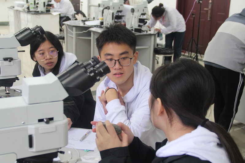 地质标本鉴定环节要求选手利用放大镜、显微镜等设备细致观察、综合取证,识别岩浆岩、沉积岩、变质岩、矿石矿片、古生物化石共五块岩石标本,进而得出一份完整全面的鉴定报告,将课上所学付诸实际。