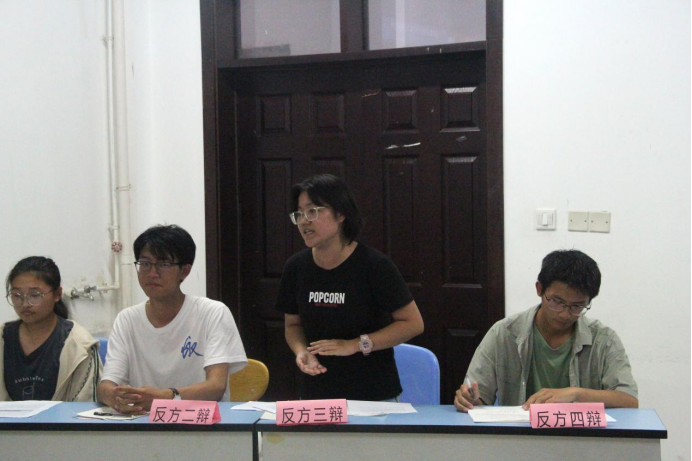 双方筑牢阵地后,比赛来到驳论环节,正反方二辩依次发言。正方二辩以当前网络匿名发言存在不完全理性为剑戟,展开了猛烈攻势。反方二辩稳住阵脚,不慌不忙巧妙应对每个问题。随着时间的推移,场上气氛愈发激烈。