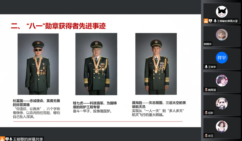 9月16日,地科系2020级硕士班团支部组织同学们通过“腾讯会议”集中学习三名“八一”勋章获得者的宝贵精神和优秀品格,学习军人对事业极端负责的严谨态度和忠诚担当的优秀品格。
