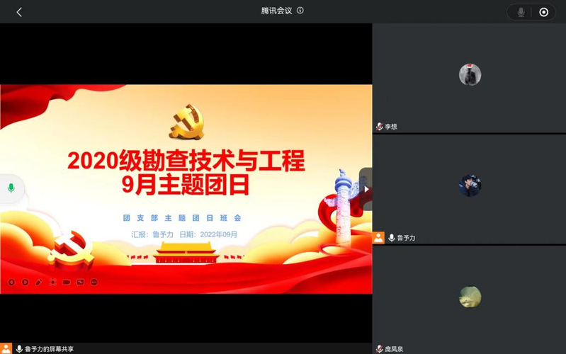 9月15日,勘查技术与工程2020级团支部就关于学习习近平总书记重要讲话精神、学习共青团会议精神和文件内容、学习“八一”勋章获得者的先进事迹等开展主题团日活动。活动包括“我和我的祖国”、“民族团结进步主题教育”、“爱我国防”三个部分,讲述新中国的诞生、黄大年教授的爱国情怀、民族团结的重要性以及强军强国的现实意义。