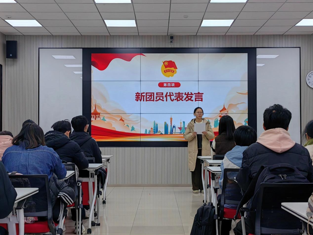 仪式继续接着,由新团员代表朱绮彤进行发言。朱绮彤从自身经历出发,提到“东方红,太阳升”这一句歌词对自身入团的启发,表达了自身对加入团组织的向往和“点亮我爱的这边片土地”的希望,她并强调深刻认识到团员应当意识到自身的勇担使命,树立明确的志向,为远大的理想前进,并激励各位团员不负韶华,不断奋斗。