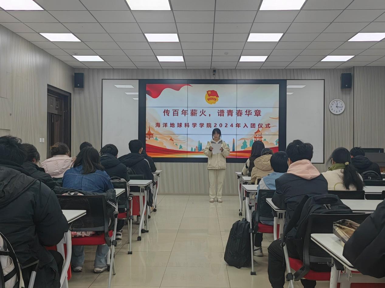 本站讯 12月9日下午,海洋地球科学学院(以下简称“学院”)2024年新发展团员“传百年薪火,谱青春华章”入团仪式在地质楼C410顺利举行。本次仪式由左思琪主持,学院团委书记张婧出席,新发展团员以及各支部团员代表参加。