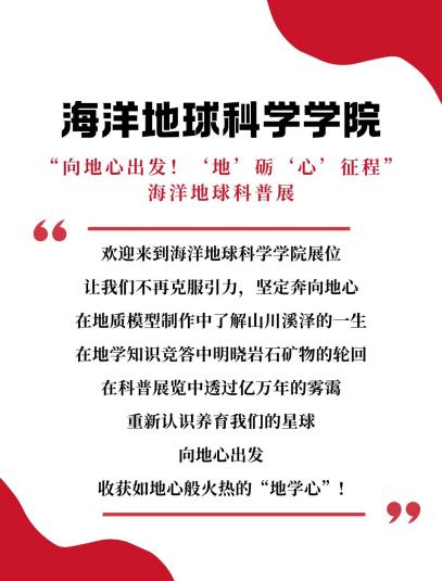 2024年11月,学院地心引力志愿者协会发布“脚下这片土地的秘密”——志愿者招募令,鼓励同学们通过制作视频、海报等科普海洋,胸怀蓝色梦想,以海大学子的视角讲述对国家战略需求的认识。