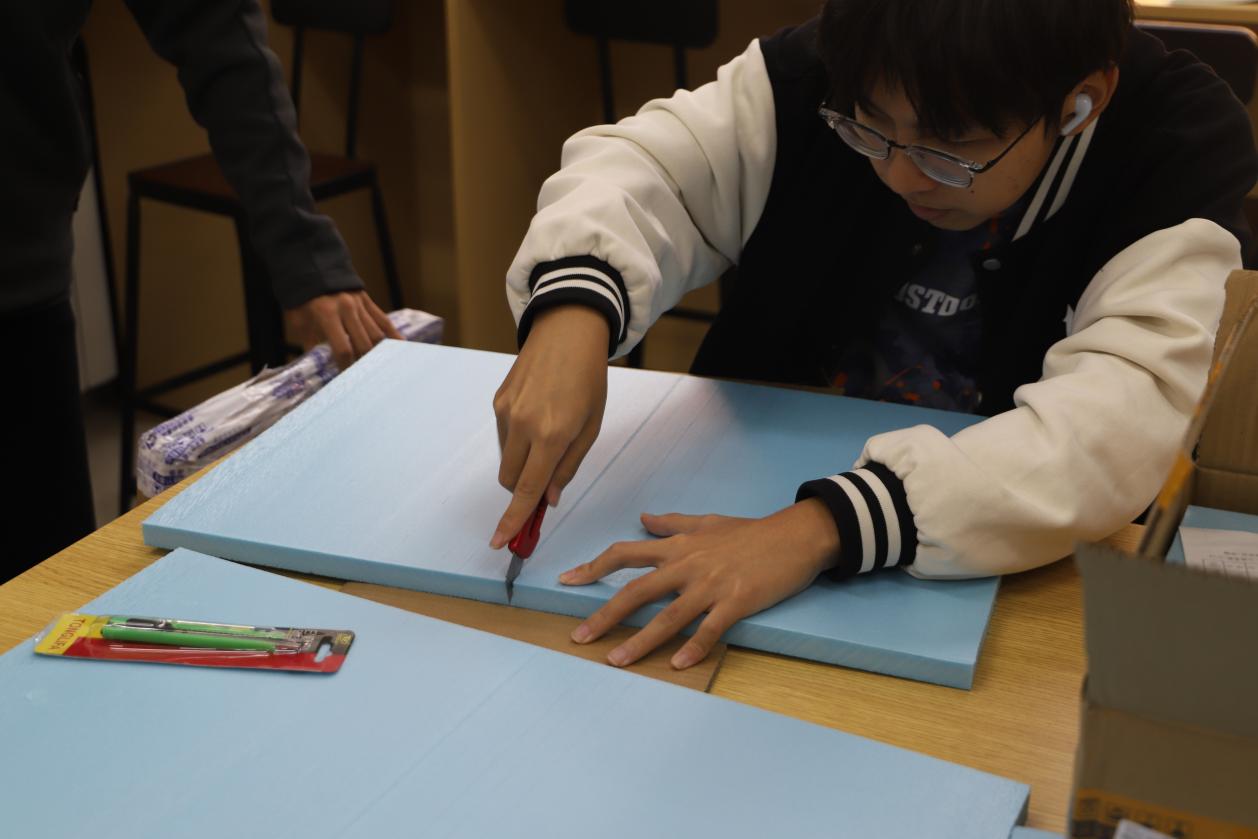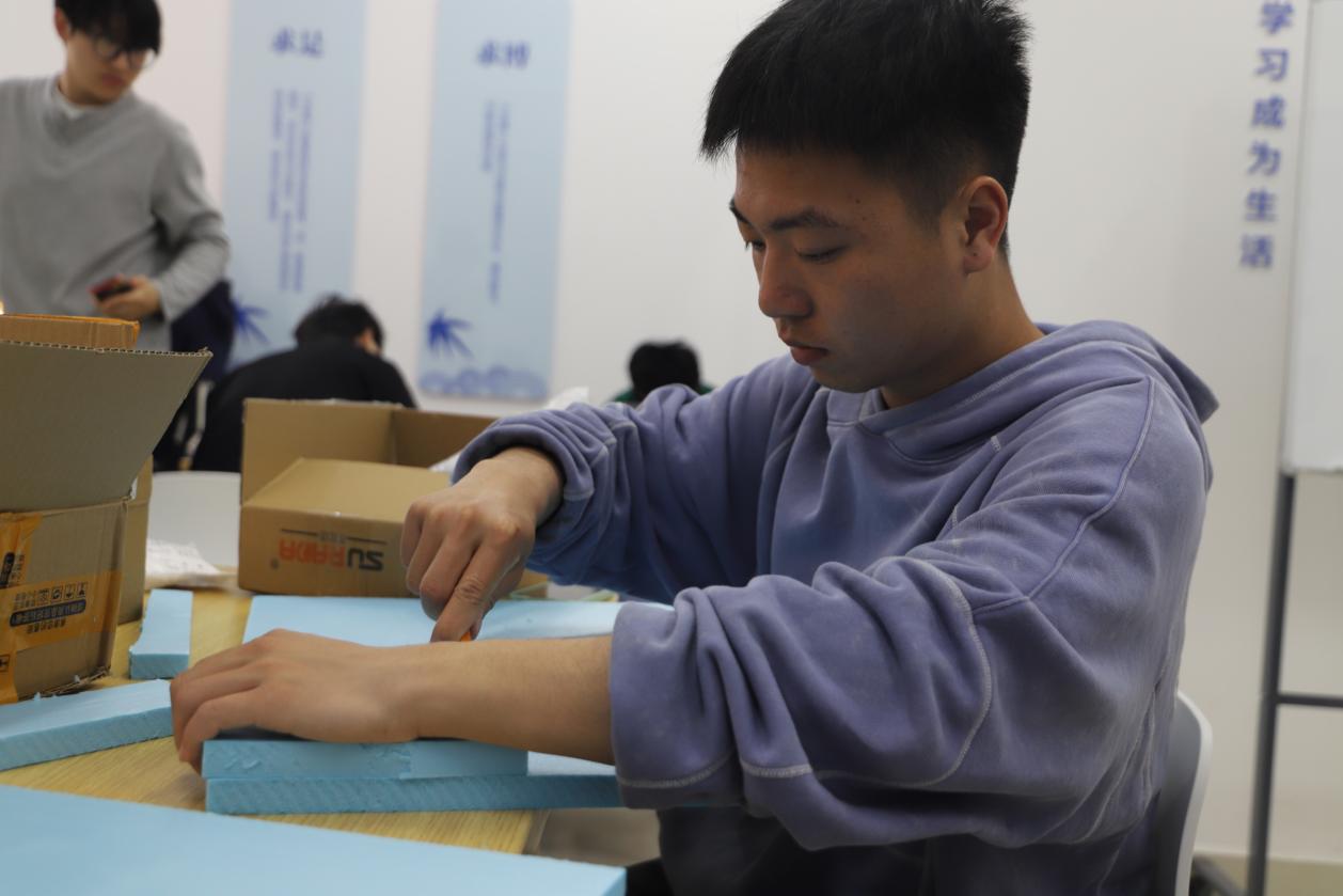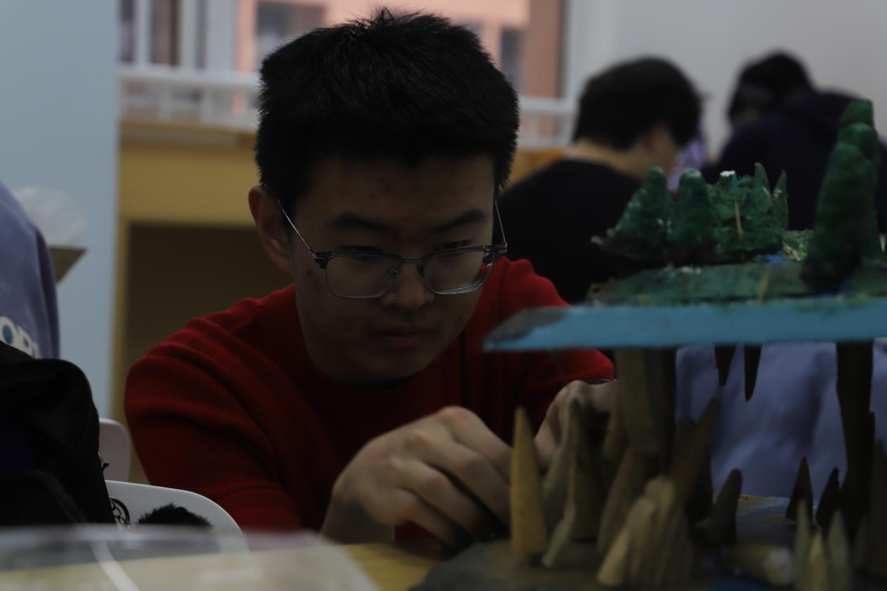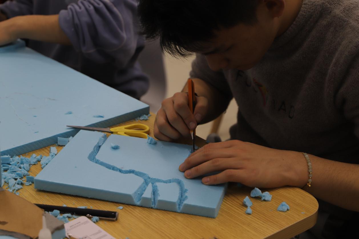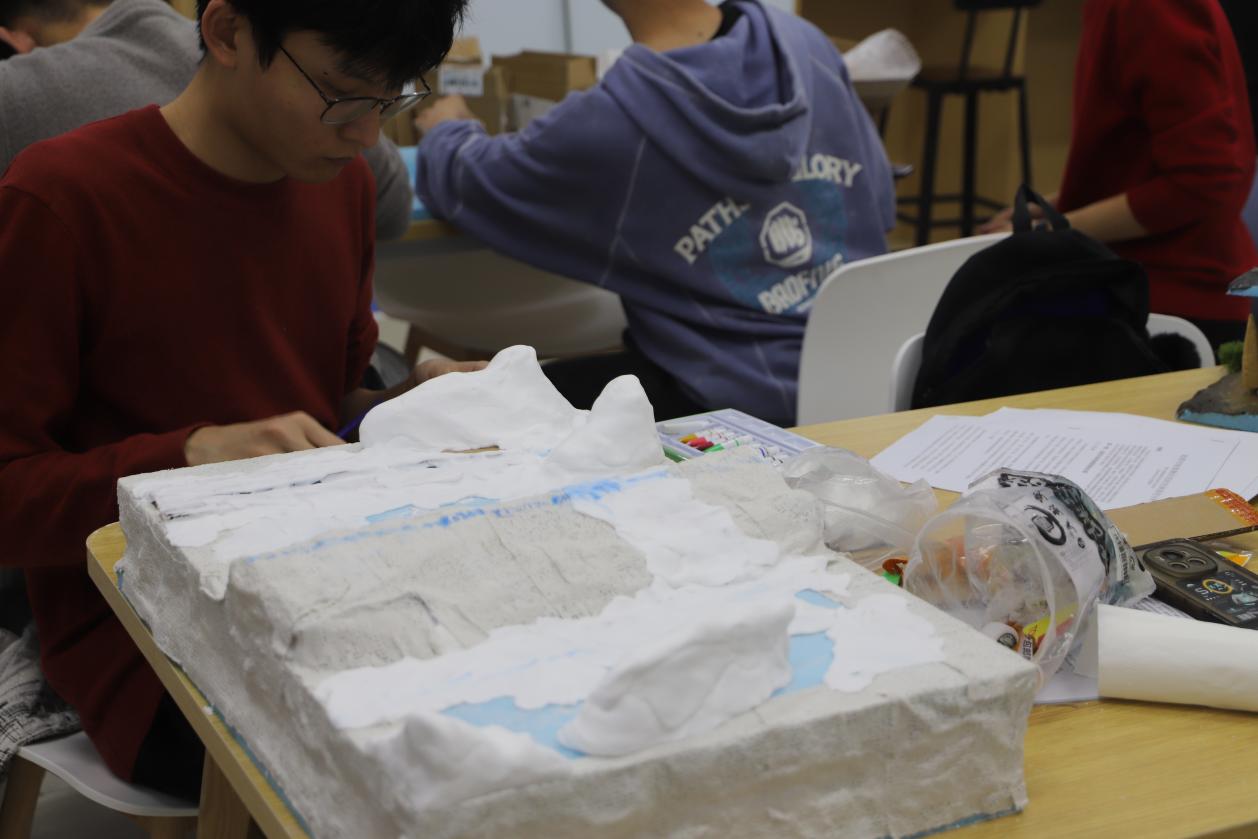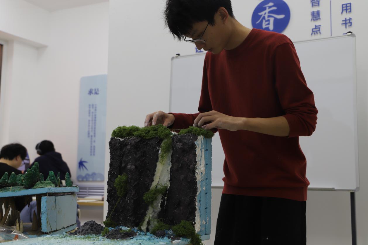 在模型搭建环节,学生们充分发挥创造力,用形形色色的材料搭建模型基底。在匠心巧手下,看似普通的材料开始初具山河雏形。更有同学选择使用废弃可回收材料,在保证美观、稳定的同时,践行环保的理念。