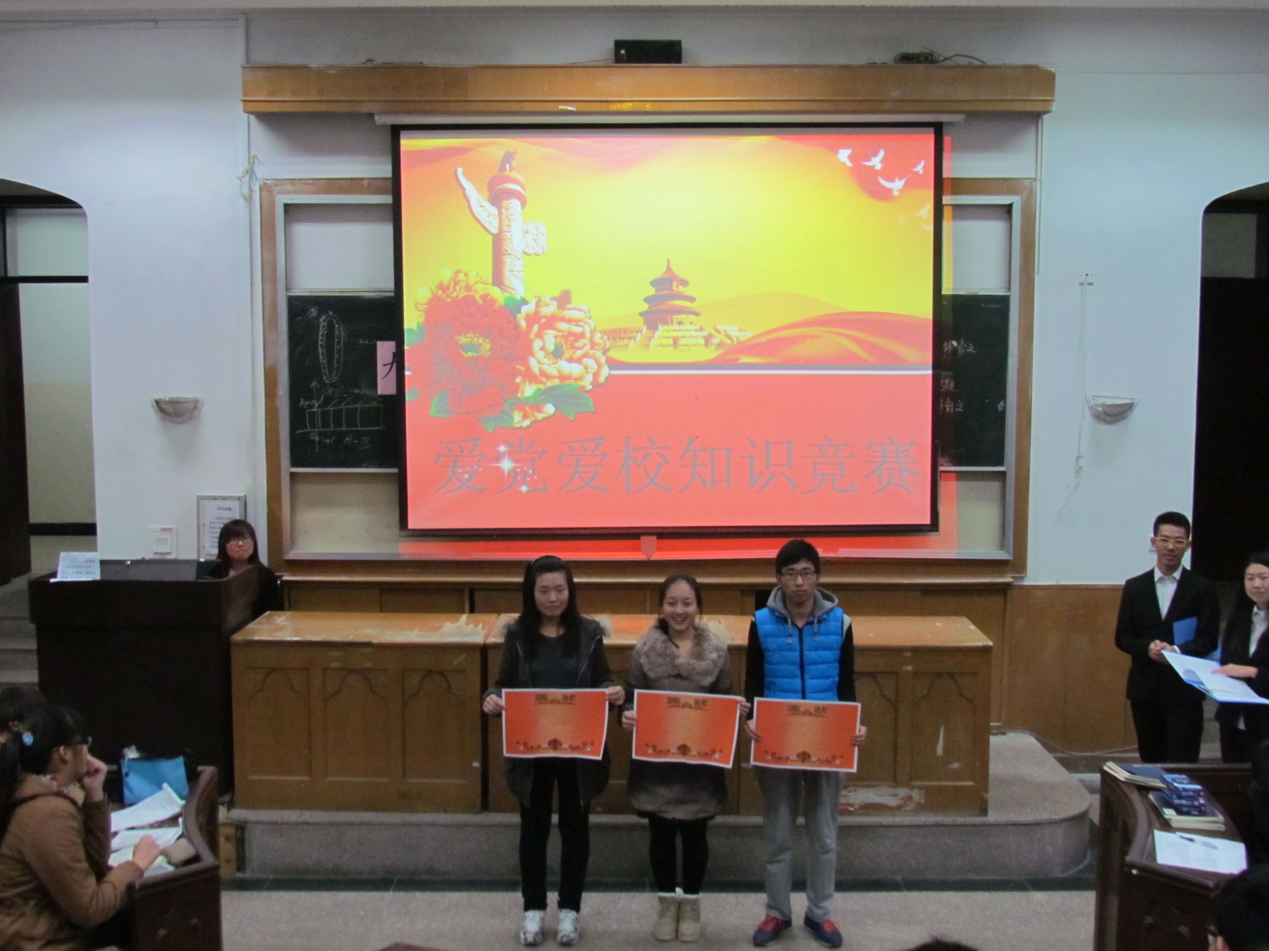 首先,主持人先向在场观众和参赛班级介绍此次知识竞赛举办的背景(2014年恰逢中国共产党建党93周年,开云电竞网址建校90周年)和目的。之后,开始进入比赛环节。第一轮为单选题,每个小组的每个成员都需回答两个小题。在这一轮中,各组势均力敌,不分上下,均回答正确。此轮结束后,进行现场互动环节“你划我猜”,在场观众积极参与。第二轮为多选题,每组通过挑选序号来回答两个小题,此轮比赛小组成员之间可以相互讨论来确定最终答案。这一轮结束后,各小组得分已产生不小的差距。生科三班在本轮失利,以45分落后其余五个小组。再次进行调整气氛的有奖问答环节后,进入第三轮:简答题。