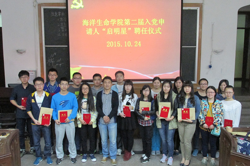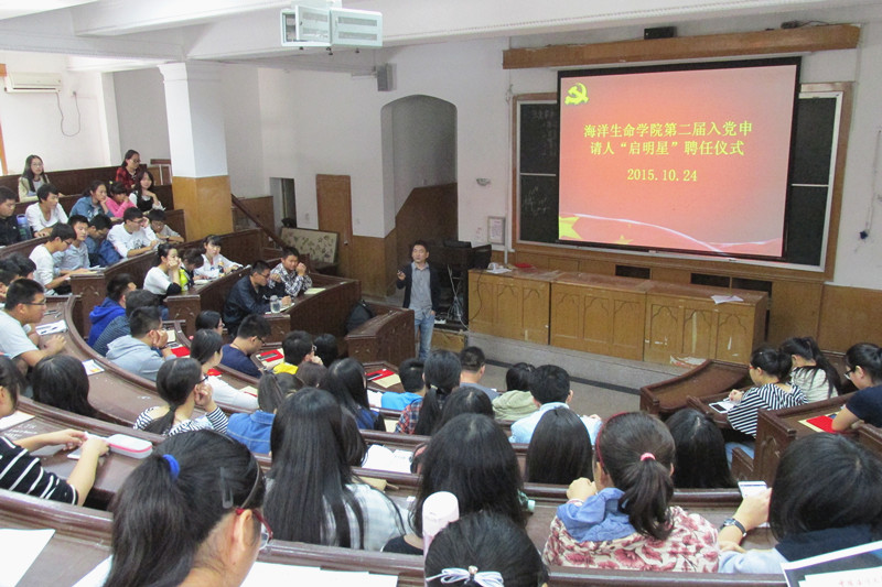10月24日下午,海洋生命学院第二届入党申请人“启明星”聘任工作仪式在鱼山校区科学馆K111顺利举行。团委书记曹少鹏主持本次仪式,并为21位研究生入党申请人“启明星”颁发聘书。
