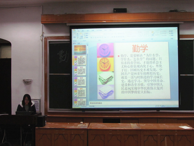 本次活动主要面向2014级入党积极分子和2015级入党申请人,活动分为小组ppt展示、小组话剧表演和评委点评三个环节。活动开始,主持人介绍了“勤学、修德、明辨、笃实”对大学生树立和培养社会主义核心价值观的积极作用。活动过程中,每个小组都进行了精彩的ppt展示和生动形象的话剧表演,展现了他们对“勤学、修德、明辨、笃实”这一主旨的理解以及这一主旨对当代大学生的现实意义。活动上,“红旗飘飘”小组表演了在拥挤的公交车上,一个青年经过一番心理斗争后给老人让座的情景,让人忍俊不禁的同时,也引发了同学们对此深刻的思考。