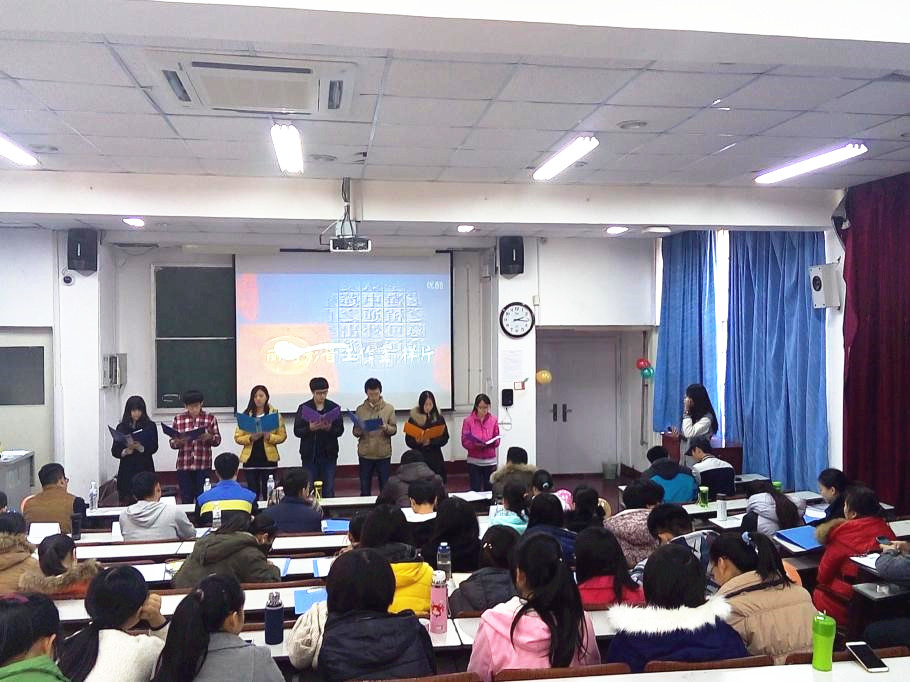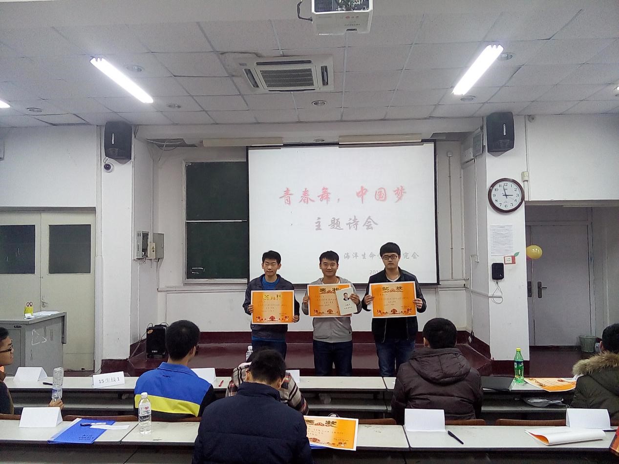 11月28日下午两点,由海洋生命学院研究会主办的“青春舞 中国梦”主题活动之“青春诗会”诗歌朗诵比赛在鱼山校区新教201教室如期举行。15级本科各班代表和入党积极分子小组参加此次比赛。各参赛队伍选派的大众评审列席本次比赛。