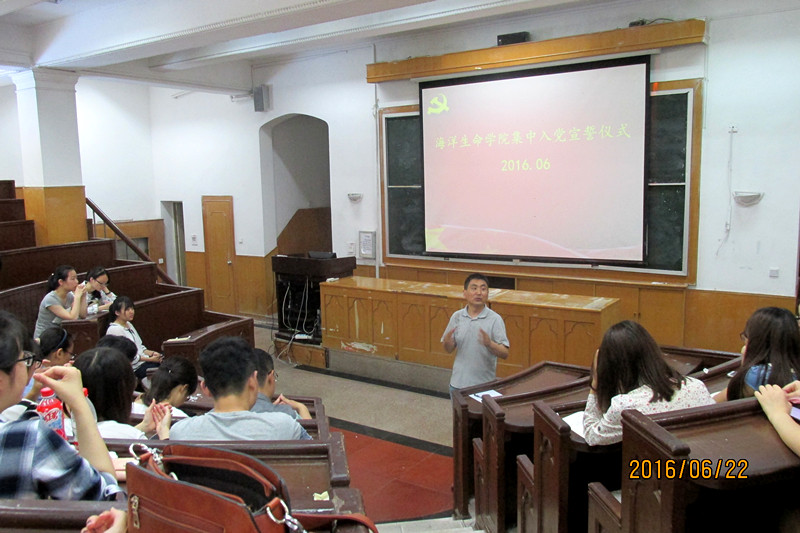 2016年6月22日中午,生命学院在鱼山校区科学馆K111对2016年发展的预备党员进行了集中入党宣誓仪式。学院团委书记曹少鹏主持并讲话。学院毕业生党员和入党积极分子参加本次仪式。