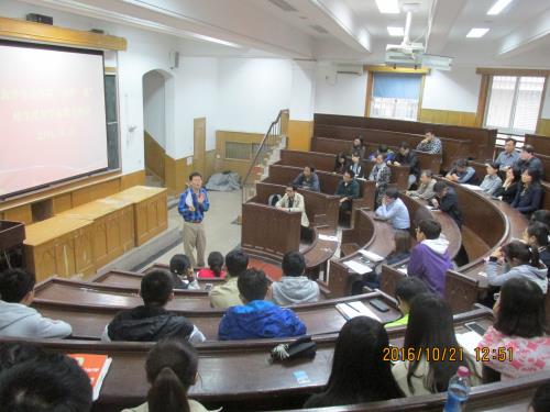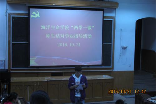 2016年10月21日中午,海洋生命学院“两学一做”师生结对学业指导活动在科学馆k111顺利开展。海洋生命学院的党委副书记于杰出席活动并讲话。学院18名教工党员,学院团委书记曹少鹏、团委副书记伍玥琪以及学院26名2015级本科学生代表参加本次活动。