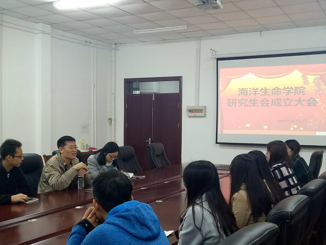 2016年11月1日下午,海洋生命学院研究生会成立大会于鱼山校区化学馆130会议室顺利召开。海洋生命学院党委副书记于杰老师、团委副书记李靓老师、海洋生命学院研究生会主席团以及各部门部长、干事参加了本次会议。大家就研究生会的工作展开了深度探讨。