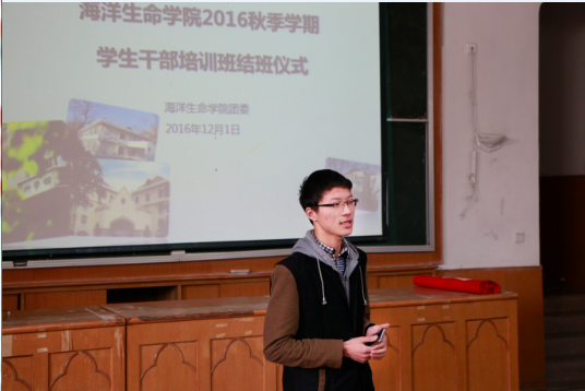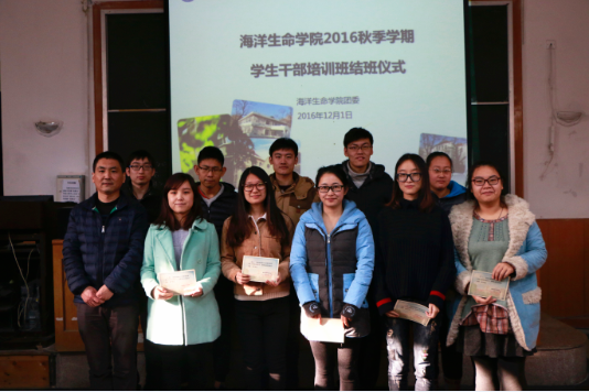 2016年12月1日下午,海洋生命学院2016秋季学期学生干部培训班结班仪式在鱼山校区科学馆K111成功举办,出席本次仪式的有院团委书记曹少鹏老师、团委副书记伍玥琪老师、全体班级负责人以及学生会和研究生会主席团成员。