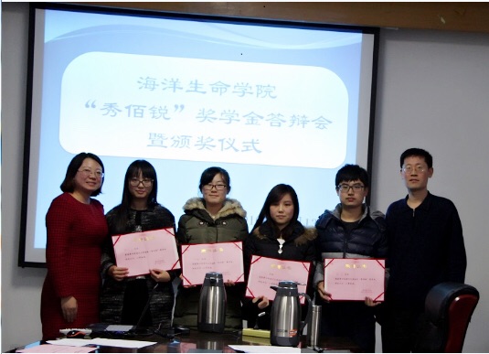 12月13号下午,由海洋生命学院举办的“秀佰锐”奖学金答辩会暨颁奖仪式在科学馆学术厅顺利举行。本次奖学金答辩由秀佰锐生物器材有限公司总经理李秀梅女士,学院党委副书记于杰老师及研究生导师代表胡晓丽教授、肖慧副教授、史晓翀副教授和学生代表担任评委。