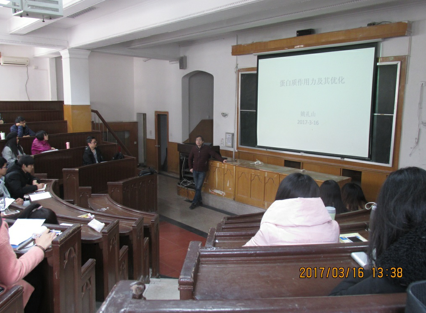 蛋白质作用力及其优化是讲座的中心内容。姚礼山研究员讲了生物核磁共振等研究手段。在讲解的过程中,他提出科学会在以后更加广阔的舞台上具有深远的影响,而这一影响是其他领域所达不到的。随后他结合自己美国求学的经历,对比中国与美国学生的不同,他指出中国学生基础扎实的优点,但是缺乏创新的思维、不善于表达自己。希望同学们能够找到自己的缺点,不断进步。最后,研究员与同学们进行现场互动,解答同学们提出的问题,并且再次建议同学们,无论将来在何处工作,一定要选择自己感兴趣的方向。