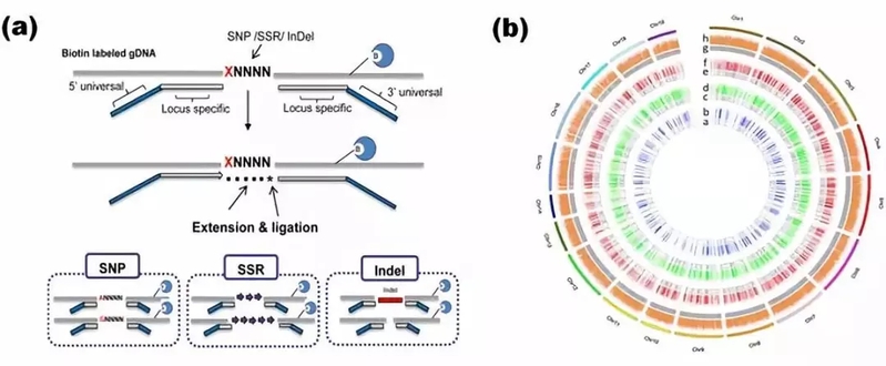 针对上述技术难题,课题组开发了可取代昂贵固相芯片平台的液相分子杂交技术HD-Marker(即“液相芯片”技术),通过在单个PCR管内的高集成度探针杂交-延伸-连接反应,实现对多达上万个已知基因变异位点进行高通量筛查和分析。该技术不仅可高效检测SNP、Indel等标记,而且解决了长期以来SSR标记依赖凝胶电泳分型,难以高通量分析的局限,实现了多种标记类型的高通量分析。