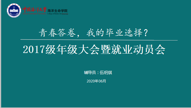 2020年6月24日下午,海洋生命学院2017级年级大会暨就业动员大会于线上顺利举行。海洋生命学院团委书记伍玥琪,辅导员贾希望,嘉宾华元瑞(2018届生物科学专业毕业生)、孙瑜(2019届生物技术专业毕业生)、刘亮洁(2018级遗传学硕士研究生)、朱玉祥(2016级生物科学)、胡萌远(2016级生态学)以及2017级全体学生参加。会议由伍玥琪主持。