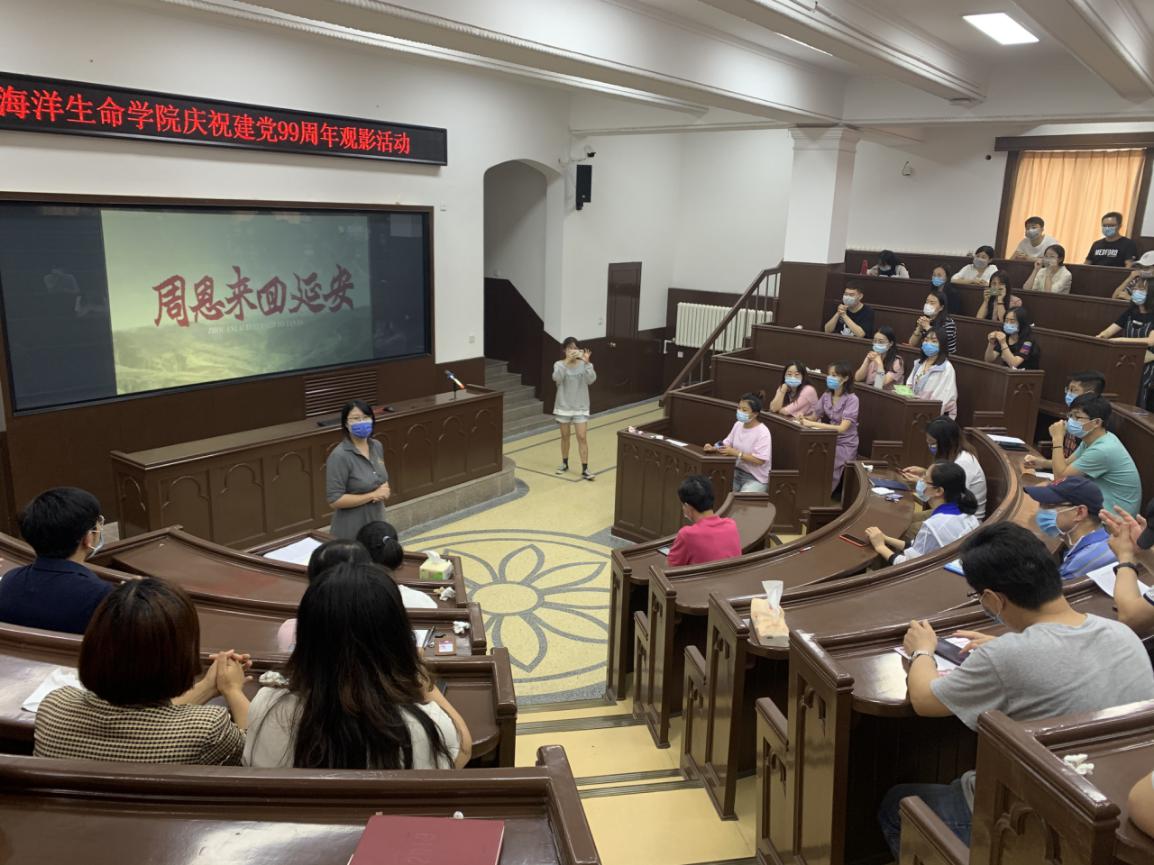 7月1日下午,为庆祝建党99周年,激励党员同志们不忘初心、牢记使命,传承红色革命精神,激发干事奋斗热情,充分发挥基层党组织战斗堡垒作用和师生党员先锋模范作用,海洋生命学院党委举办庆祝建党99周年观影活动。学院师生党员在科学馆K111教室一起观看了《周恩来回延安》影片,学院党委书记初建松、党委副书记张晓燕参与活动,活动由团委书记伍玥琪主持。