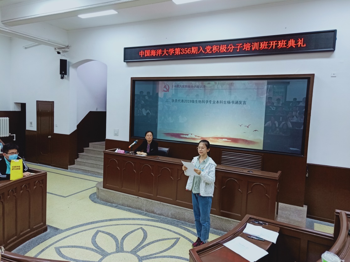 接着,2019级生物科学专业本科生杨书涵作为学员代表发言,她讲到我们党走过了99年的风雨征程,这九十多年的历史,是几代共产党人在同一信仰凝聚下、同一理想推动下、同一信念引导下、同一追求驱动下,为实现国家富强,民族振兴,人民幸福而英勇奋斗的历史。她号召全体学员认真开展党课学习,遵守党课纪律,以党员标准严格要求自己,学习榜样精神,发挥模范带头作用,自觉接受党组织的教育、培养和考察,争取以更大的进步回报党组织的关怀和期望。