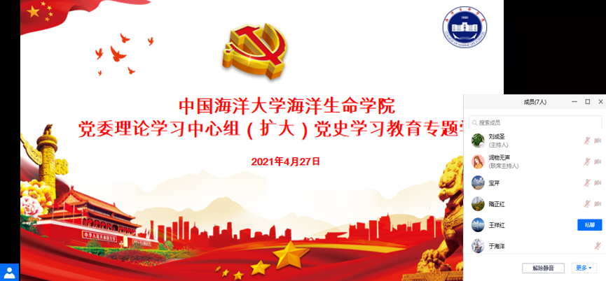 为深入贯彻落实党史学习教育要求,进一步增强干部教师的理想信念、党性修养,4月27日上午,海洋生命学院通过线上与线下相结合的方式,在鱼山校区化学馆130会议室召开党委理论学习中心组(扩大)会,会议由学院党委书记初建松主持。