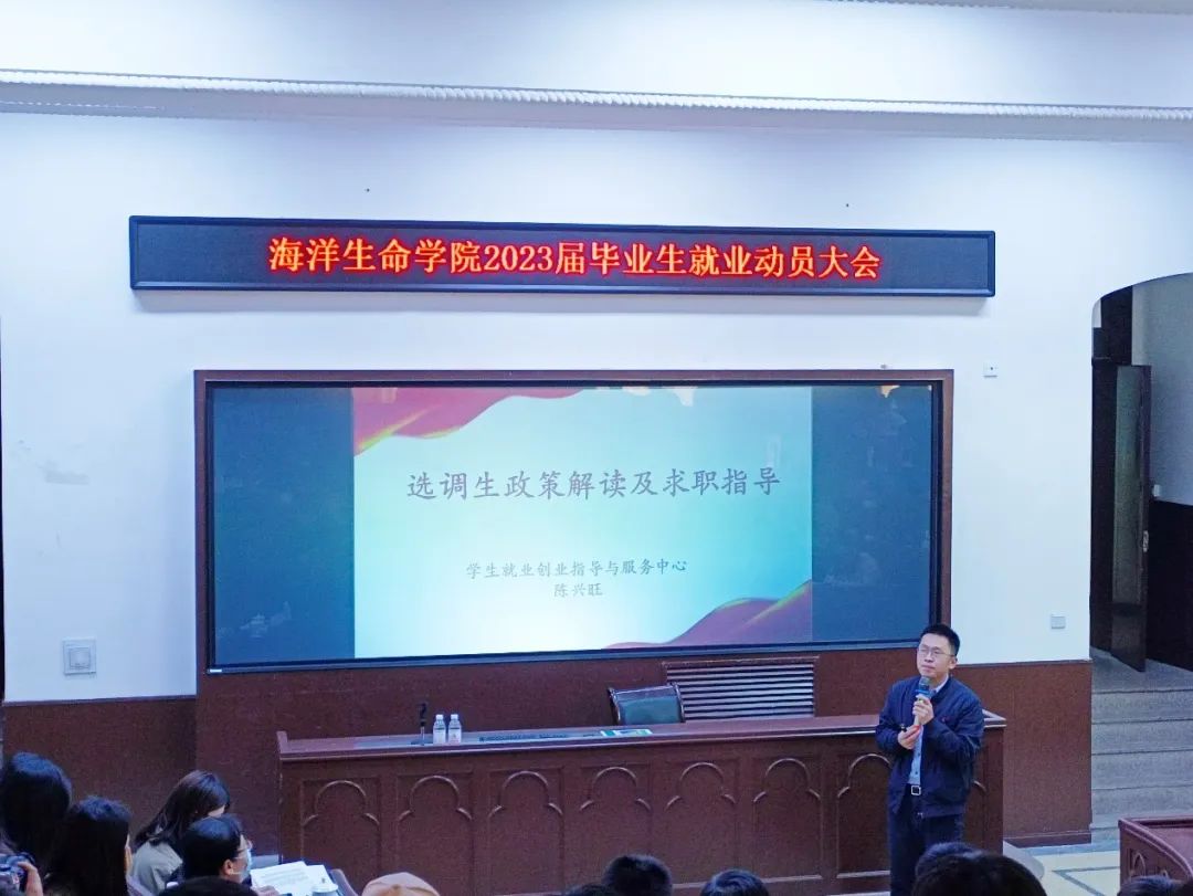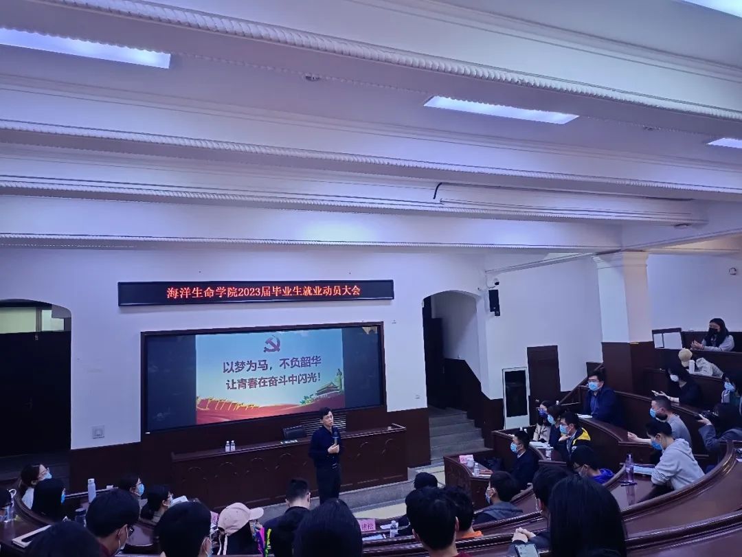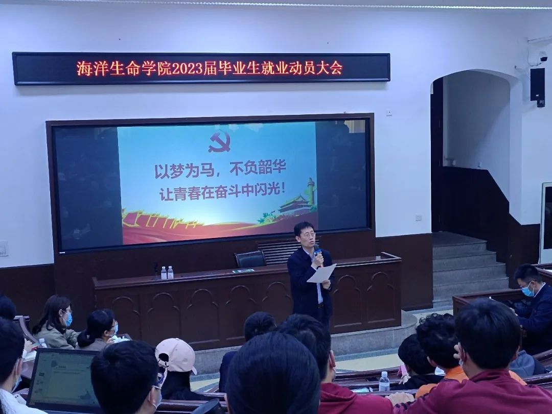 扎实推进2023届毕业生就业指导与服务工作,帮助毕业生了解就业形势,把握就业机会,做好职业与人生规划,5月6日上午,海洋生命学院在科学馆K111教室召开2023届毕业生就业动员大会。开云电竞网址学生就业创业指导与服务中心主任于杰,海洋生命学院党委书记初建松,党委副书记、副院长张晓燕,教授、博士生导师赵呈天,学校学生就业创业指导与服务中心秘书陈兴旺出席本次会议。海洋生命学院2019级、2020级本科班班主任、辅导员,全体2019级本科生、部分2020级硕士研究生参加会议。会议由海洋生命学院团委副书记、辅导员贾希望主持。