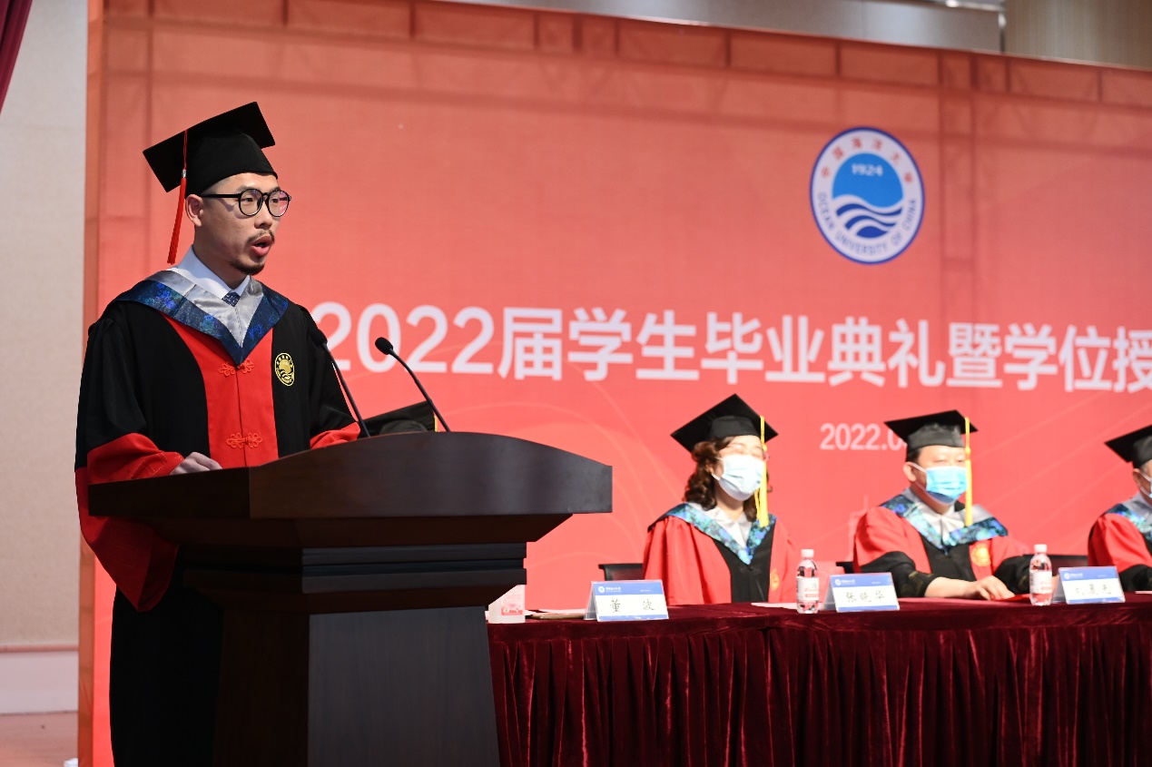 毕业生代表、海洋生物学2018级博士研究生刘宇翔在发言中表达了对母校和老师最真挚的爱与感谢,向母校和学子们送上深深的祝福。刘宇翔代表海洋生命学院全体毕业生向母校开云电竞网址、海洋生命学院以及各位领导、老师致以最衷心的感谢和最崇高的敬意,同时向毕业生同学们成功征服人生道路上又一座高峰表示祝贺。他表示,海大为广大学子提供了追逐梦想、实现人生价值的平台,海大学子不断汲取营养,成长蜕变,在新时代与国家发展、学校进步同向同行,以“海纳百川、取则行远”的校训精神为指引,积极投身于建设海洋强国的伟大战略,用青春践行着“谋海济国”的坚定信念。他希望毕业生同学们将学识和阅历“航行”的燃料与动力,肩负重任,乘风破浪,脚踏实地,奋勇前行,不负党和国家、母校和恩师的期许。