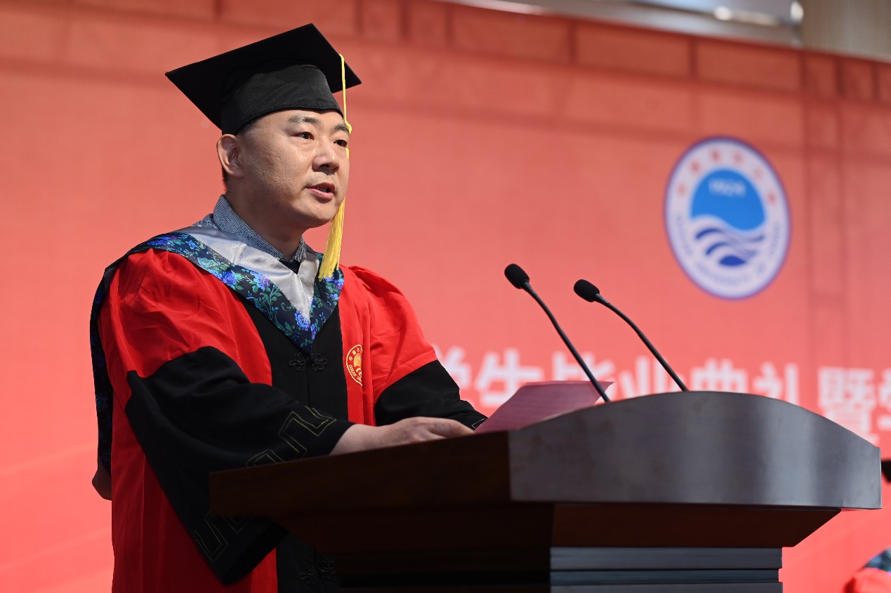 学院院长张玉忠代表学院全体师生员工向毕业生们圆满完成学业表示热烈的祝贺,同时向为同学们成长付出心血和汗水的老师们、家人们表示衷心的感谢。张玉忠表示,九十多年来,学院以治学报国为己任,培育出众多优秀学子。通过研究生阶段的学习和实践,同学们进一步加深和拓宽了生命科学、生态学的基础理论知识,掌握了科学研究的思路和方法,提升了创新创造的能力,所获得的能力和品质为同学们步入社会、走向未来打下了坚实基础。他对毕业生们提出了三点期望和建议:一是“自信而不骄傲”,秉承“求是笃行,谋海济国”的院训精神,不断努力开拓,为个人的未来和祖国的明天不竭奋斗;二是“勇于担当”,将自己铸造为具有“家国情怀、国际视野、厚实基础、勇于创新”的海大生命科学人;三是“保持批判性思维与创新”,科学的目的是追求真理,批判性思维是探索真理的基因,要善于提出疑问,并创造性地解答疑问,不断取得创新性的成果,推动科学发展。