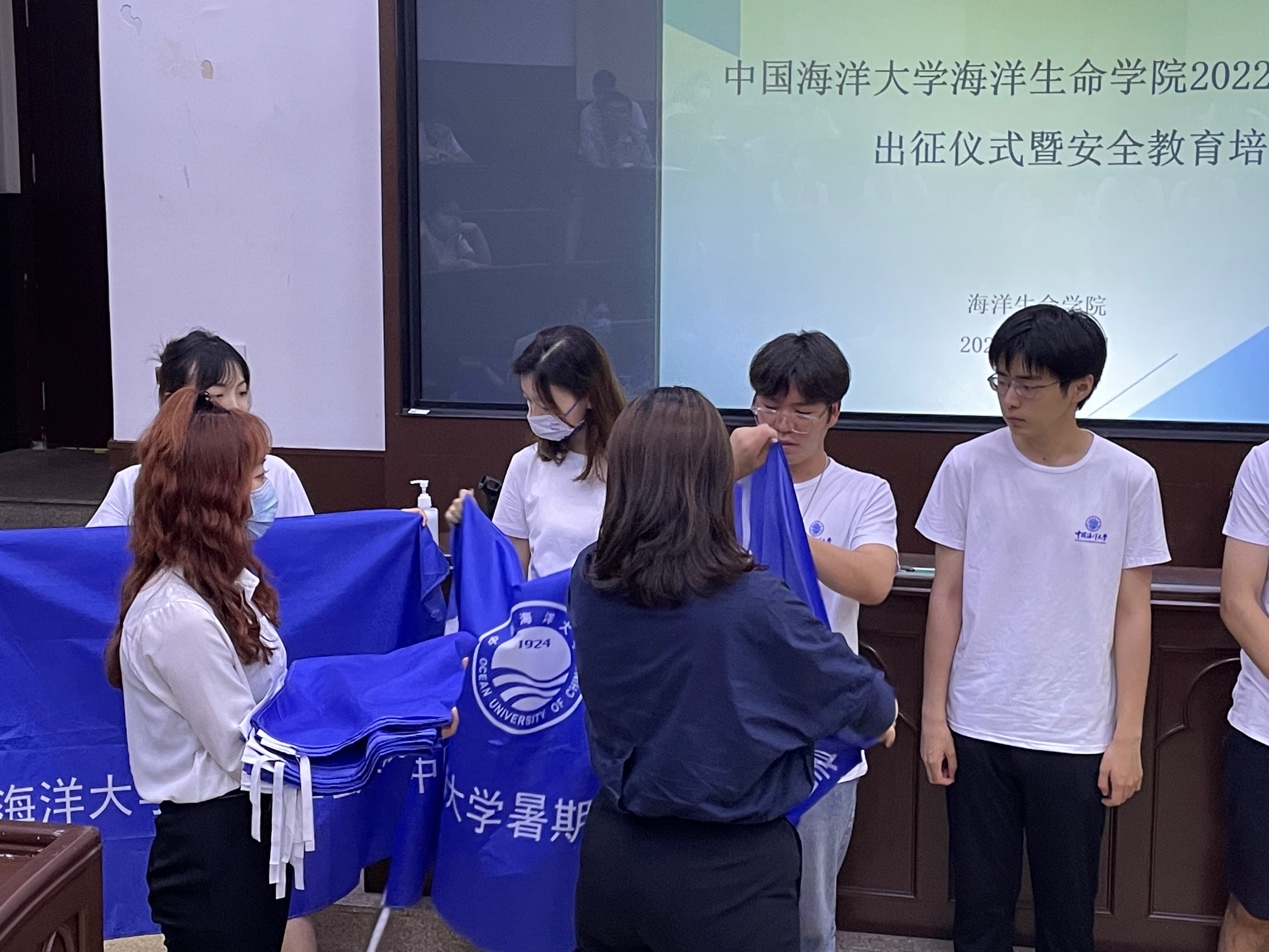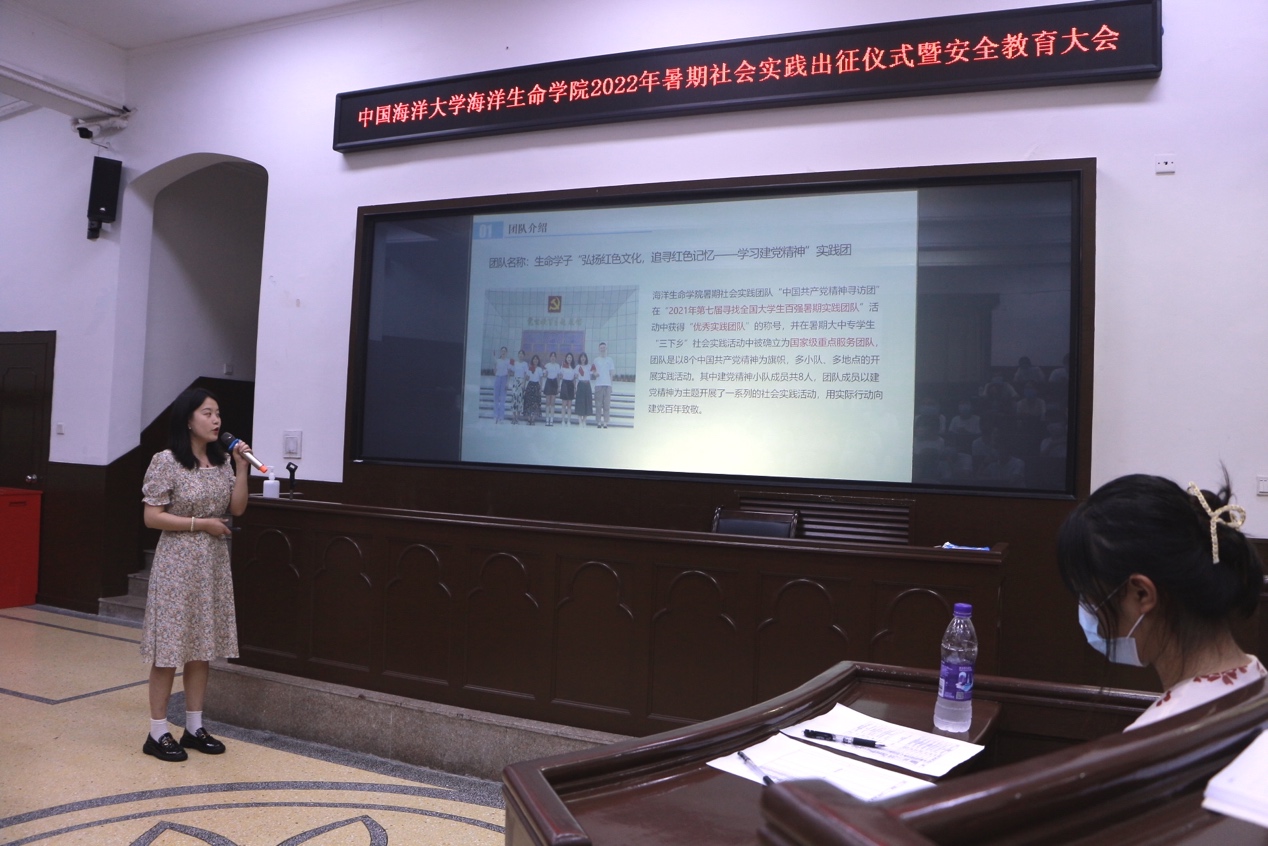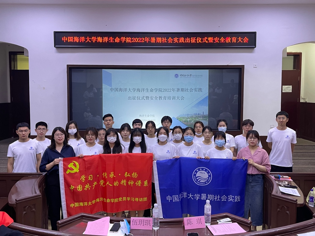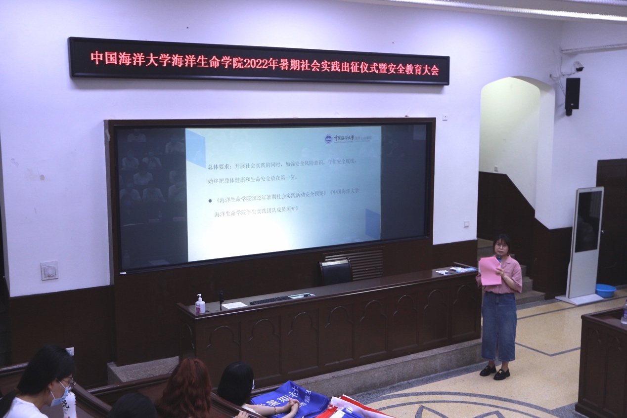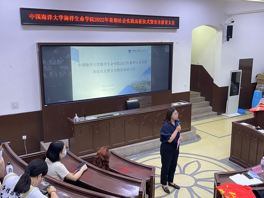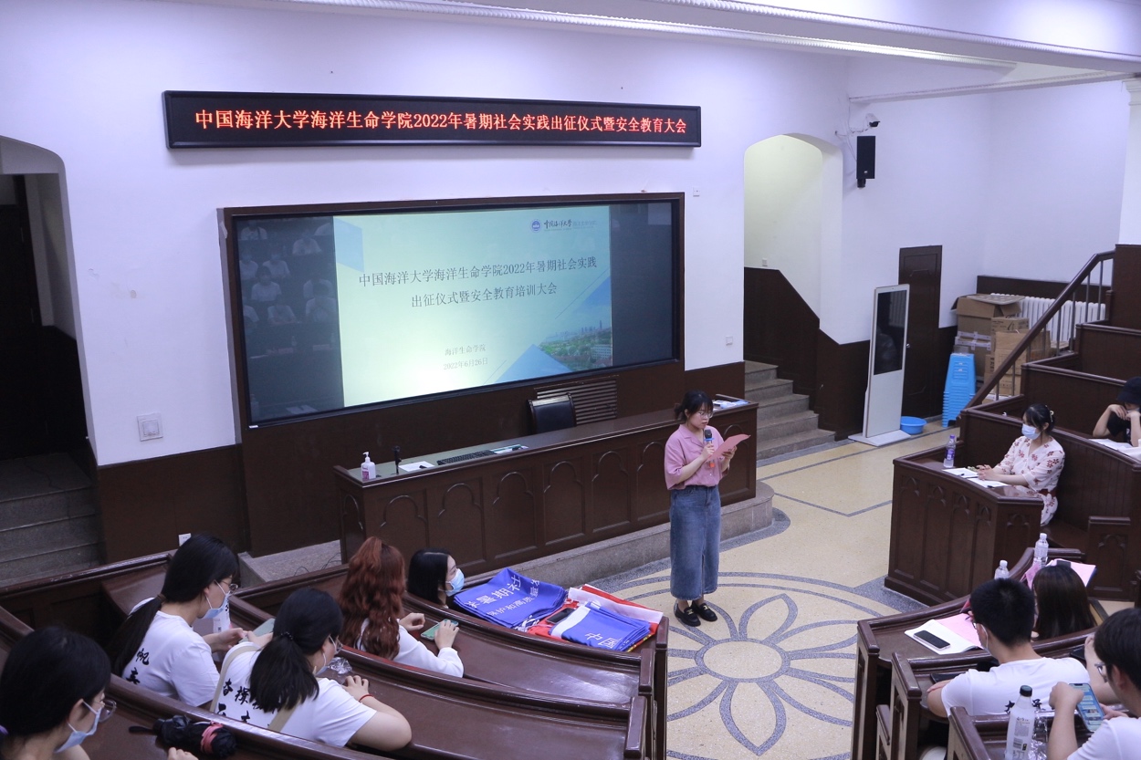 6月26日下午,海洋生命学院2022年“喜迎二十大、奋进新征程”暑期社会实践出征仪式暨安全教育培训大会在鱼山校区科学馆K111教室举行。学院团委书记伍玥琪、2022年暑期社会实践学生团队代表和2021-2022年“青年马克思主义者培养工程”学生骨干培训班全体学员参加了此次会议。会议由学院团委实践部部长陈琪主持。