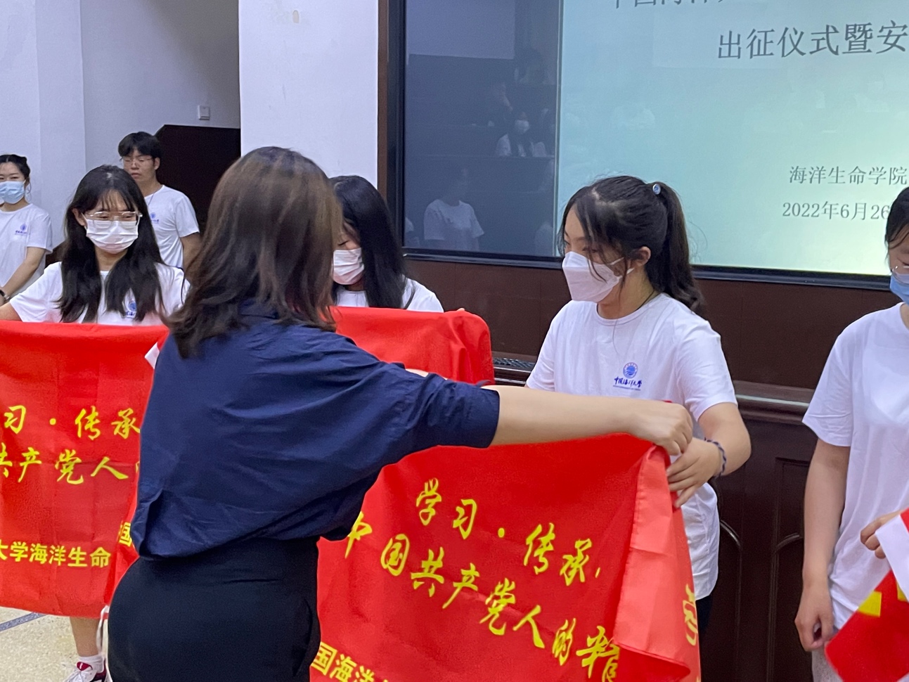 会议第五项,授旗仪式,伍玥琪向学院2022年各暑期社会实践学生团队颁授队旗。