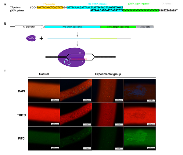 图1 利用CRISPR / LbCas12a系统对龙须菜进行基因编辑。通过体外转录本合成gRNA后(A),与Cas12a蛋白进行孵育后转化到龙须菜藻尖中(B),在藻尖中检测到了转化细胞自发荧光发生了变化(C)