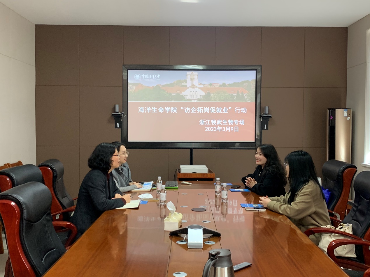 为深入贯彻落实党中央、国务院、山东省关于高校毕业生就业工作安排部署和教育部“访企拓岗促就业”专项行动要求,3月9日上午,应海洋生命学院之邀,浙江我武生物科技股份有限公司人事主管宋宪蕊一行来到学院科学馆座谈,学院党委副书记、副院长张晓燕会见了宋宪蕊一行。双方针对行业发展、人才培养、人才需求等进行了深入交流,以期为毕业生提供更加精准的就业指导,进一步拓展毕业生就业渠道。海洋生命学院辅导员王音波、张润阳参加座谈。