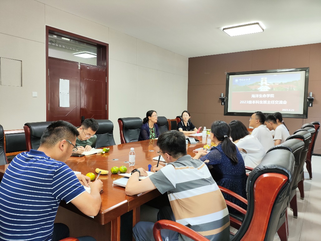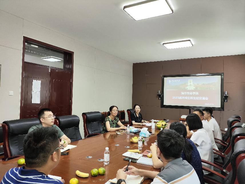 8月23日下午,海洋生命学院2023级本科生班主任交流会暨2023级本科生班助聘任仪式在鱼山校区科学馆215会议室召开,学院党委副书记张晓燕,团委书记贾希望,2023级各班班主任及班主任助理参会。会议由学院专职团干部、2023级本科生新生辅导员王音波主持。