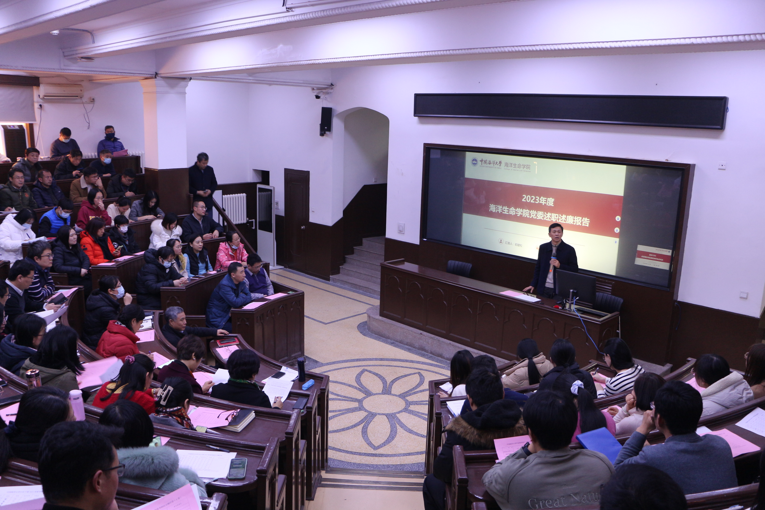 求是笃行守初心,谋海济国展新颜,2024年1月4日下午,海洋生命学院在科学馆K111召开2023年度领导班子述职述廉大会,学院领导班子参与大会并作汇报,学院全体教职工、部分学生代表参加会议,会议由党委书记初建松主持。