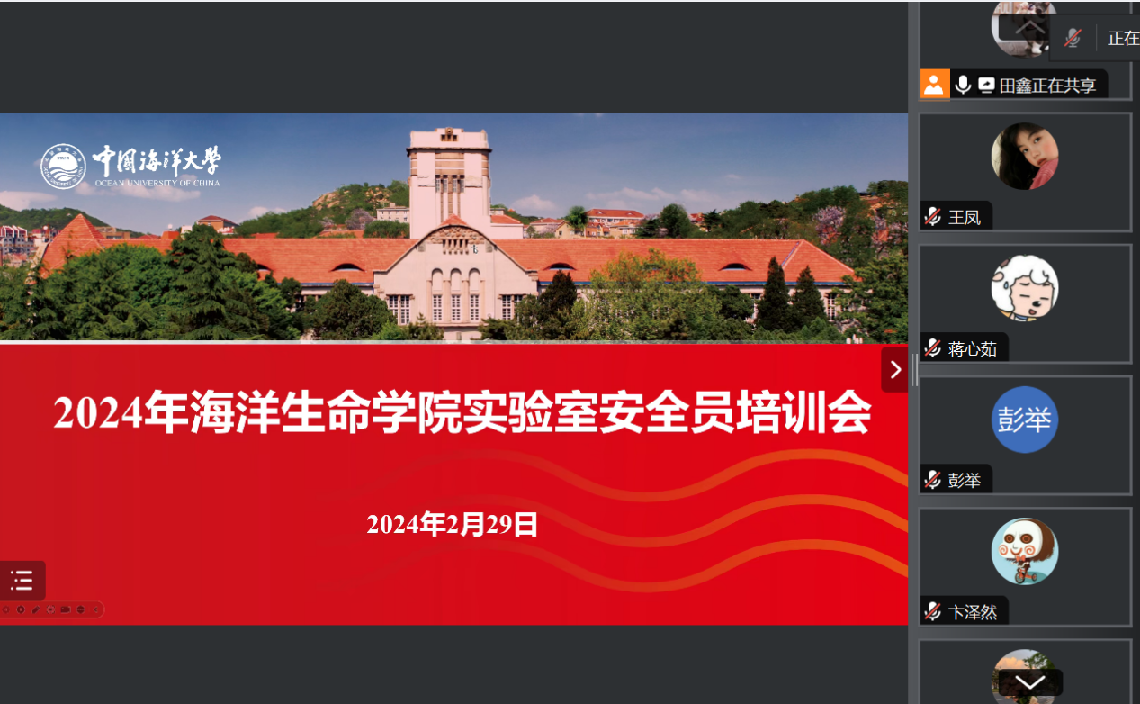 2月29日,海洋生命学院专职团干部田鑫主持实验室安全员线上培训会议。会上,田鑫针对电动车安全管理规定及实验室各项安全守则,要求学生严格落实,规范遵循操作流程。