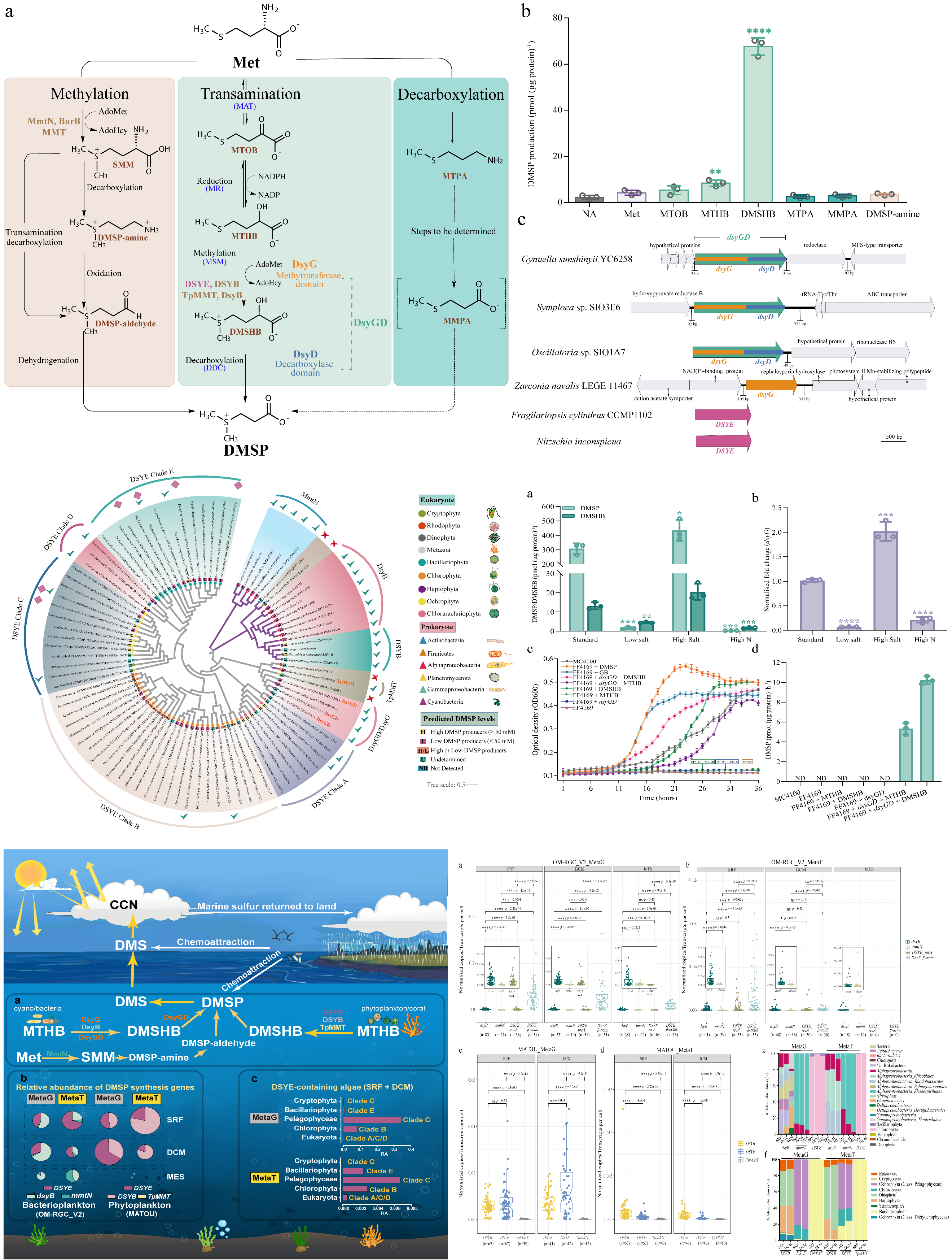 该项研究利用分子生物学等手段从盐沼植物的根际细菌中鉴定出了一种新型双结构域的DMSP合成酶DsyGD,具有甲基转移酶结构域DsyG和脱羧酶结构域DsyD,通过甲基转移和脱羧作用将DMSP转氨基通路的中间产物催化合成DMSP。进一步对678个藻类的转录组进行分析,发现多种藻类中含有与DsyG亲缘关系较远的蛋白,被命名为DSYE。DSYE同样具有催化转氨基通路的中间产物合成DMSP的活性,并且DSYE编码基因的全球丰度超过了先前已知的藻类DMSP合成基因。藻类培养实验也证明了这些含有DSYE的藻类能够合成高浓度的DMSP,而此前未有报道这些藻类具有DMSP合成能力。这些新发现的DMSP合成藻类在全球广泛分布,其中抑食金藻(Aureococcus anophagefferens)是我国近几年褐潮暴发的主要浮游微藻,为海洋生态系统贡献了大量的DMSP。该项研究极大地扩充了DMSP合成微型生物的种类,强调了含DSYE的藻类在海洋硫循环中的重要性。