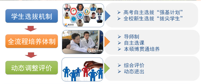 为服务国家重大战略需求,加强基础学科拔尖创新人才培养,生物科学强基计划和拔尖班依托国家重点学科、国家实验室、教育部重点实验室、国家级实验教学示范中心等校内外优质资源,建立了夯实家国情怀、国际视野、基础厚实、勇于创新的创新人才培养体系。生物科学拔尖学生培养基地制定了生物科学强基计划拔尖学生招生办法,采取“3+1+1+4本研贯通培养模式:前三年主要进行通识教育、学科教育与科研训练;达到培养条件的,第四和第五年,接受研究生专业教育、开展科学研究;通过硕博连读选拔的,进入后四年的博士生培养阶段。
