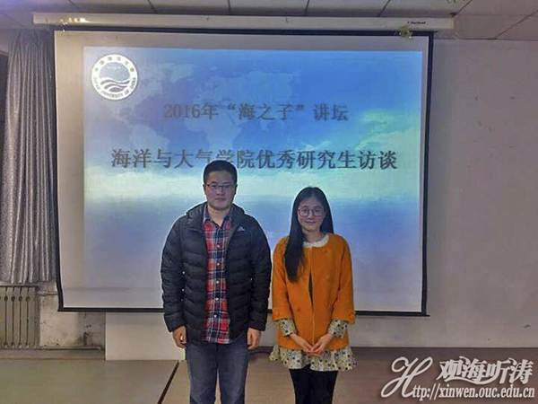 本站讯为了给研究生营造一个良好的学术氛围,使研究生更好地规划科研生涯,由海洋与大气学院研究生会承办的“海之子”讲坛——优秀研究生访谈活动于11月29日晚在海洋与大气学院举行。2014级物理海洋博士赵小龙和2015级物理海洋硕士王晓琦两位优秀研究生代表被邀做客本次访谈活动。