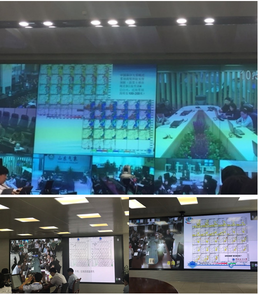 上图:中国气象局台风与海洋预报中心;下图:青岛上合峰会期间的青岛气象台;图中屏幕展示信息来自海雾预报系统(http://222.195.136.24)