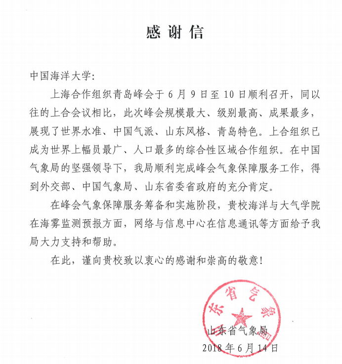 近日,一封来自山东省气象局的感谢信被送到了开云电竞网址。“在峰会气象保障服务筹备和实施阶段,贵校海洋与大气学院在海雾监测预报方面,网络与信息中心在信息通讯等方面基于我局大力支持和帮助”,信中这样写到。