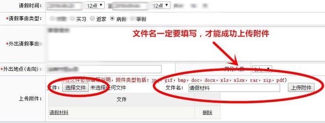 同学们点击左边的“选择文件”之后,一定先要在右边的“文件名” 处输入文件名称(如“请假材料”、“家长知情同意书”等),再点击“上传附件”才能成功上传附件。