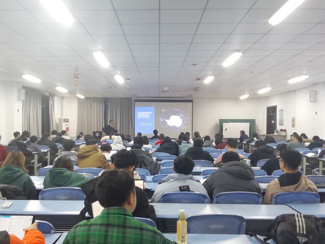 随后,史久新为同学们讲述了“雪龙号”首航南极、建设长城站、进行海洋观测、收放潜标和第11、31、34、36次中国南极科学考察的故事。他简要介绍了中国的数个南极考察站,并为同学们播放了“雪龙2号”的科普视频。南极考察的故事引起了不少同学对于南极考察的好奇与兴趣,同学们踊跃地参与课堂活动。此外,史久新结合专业,向同学们简要讲解了南极海冰数值模拟、南大洋在全球变暖的作用和全球变暖的停滞等问题。