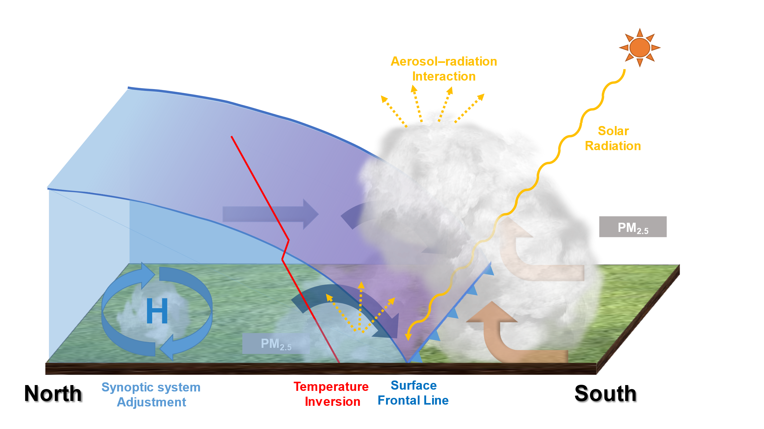 华北平原经济发达、人口稠密、空气污染严重。冷锋是影响冬季华北地区的典型天气过程,通常冷锋过境会清除大气中的污染物。本研究通过数值模拟揭示了其造成空气质量恶化的机制(图1)。研究表明,冷锋可以通过区域传输及锋面逆温使近地面PM2.5浓度升高:污染物随冷锋传输,导致下游地区污染加剧,污染物在锋前可抬升至约3km高度;同时锋面逆温可造成近地面PM2.5浓度在锋后缓慢上升。伴随冷锋过境的高压中心东移,有利于污染物向华北平原西部和北部地区传输。另外,冷锋过境还可通过影响气溶胶与辐射的相互作用(ARI)间接影响近地面空气质量:ARI可使到达地表的太阳辐射减少超过100W·m-2,2m高度气温下降近1°C和大气稳定度增加,导致近地面(锋前1km、锋后0.5km以下)PM2.5浓度上升约40μg·m-3。在气候变化造成寒潮爆发等极端事件增多的背景下,深入研究冷锋对空气污染的双重作用对我国未来大气污染防治工作具有重要意义。