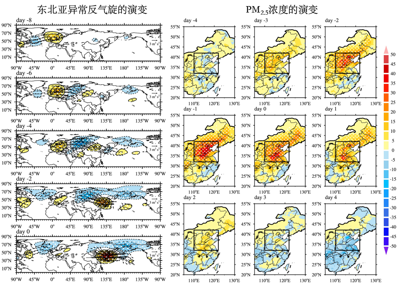 图1. 东北亚异常反气旋的季节内演变(500 hPa波作用通量和位势高度异常)(左图)及其对应的华北PM2.5的演变(右图)