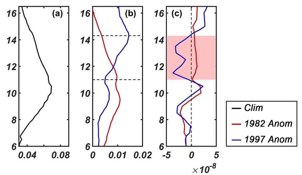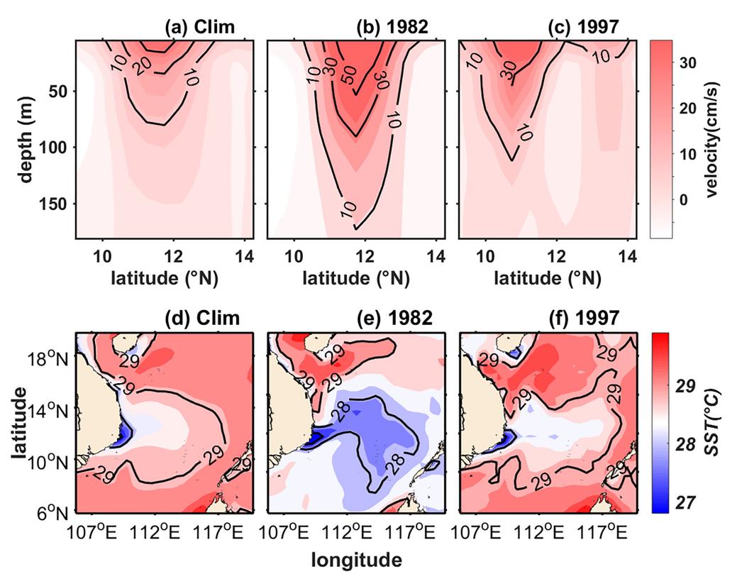 基于SODA3.3.1再分析资料,该成果发现1982年和1997年夏季的SEJ伴随El Niño事件的发展均有增强,但是两次增强的幅度有显著差异:与气候态平均值相比,SEJ强度在1982年的增幅为256%,在1997年的增幅仅为52%(图1)。El Niño发展年的SEJ增强源于南海夏季风的加强,而增强幅度的显著差异则主要归因于风场空间结构的差异性(图2):1982年夏季,风应力异常场加强了气候态的拱形结构,有效地加强了风应力旋度,进而使得SEJ增强;1997年夏季,风应力异常场则没有形成拱形结构,从而减弱了SEJ的增幅。本研究通过构造风应力异常场进行敏感性试验,进一步证实了风应力异常场的拱形结构对SEJ增幅强度的重要性。南海夏季风异常场的空间结构与El Niño事件的演变特征有关,使得El Niño事件导致的异常反气旋北翼处于南海不同的纬度,分别对应着1982年和1997年夏季风应力异常场的差异。
