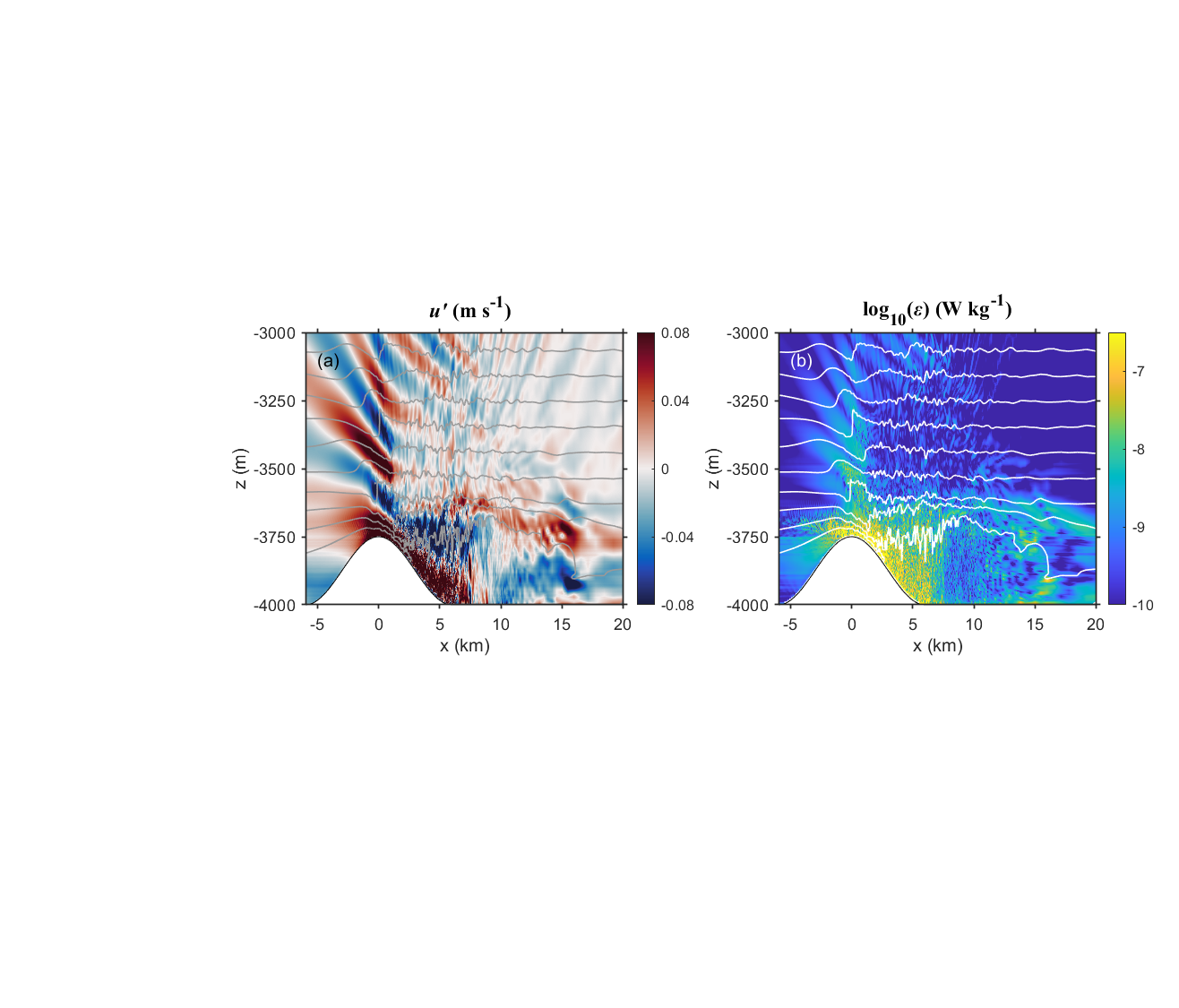 图2. 模式模拟结果,背风波充分发展时其脉动速度(a)及耗散率(b)的分布。